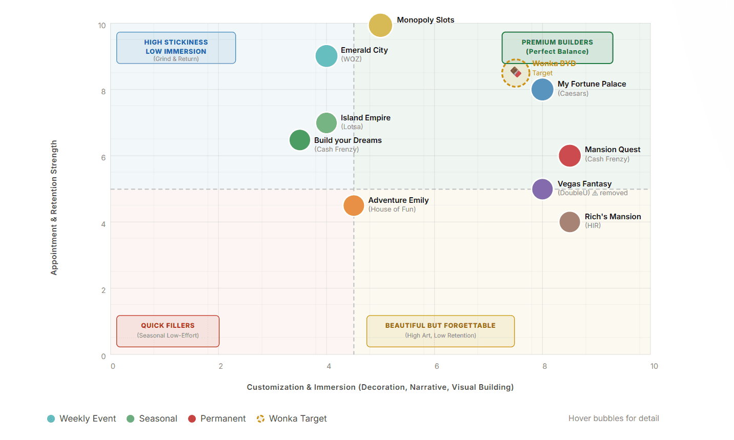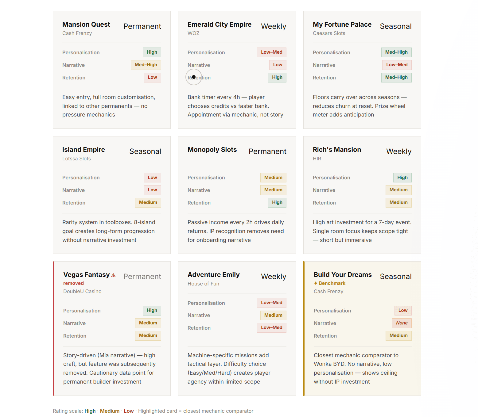 Before opening Figma, we ran a structured competitive benchmark across 10+ titles, mapping mechanics, monetisation strategies, and failure patterns across social casino and casual builder games.