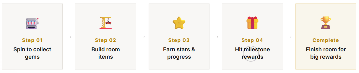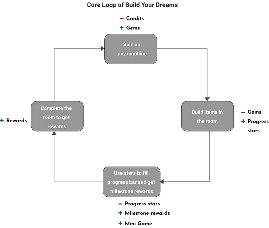 Core loop flow from spin through gem collection, building, milestones and room completion.